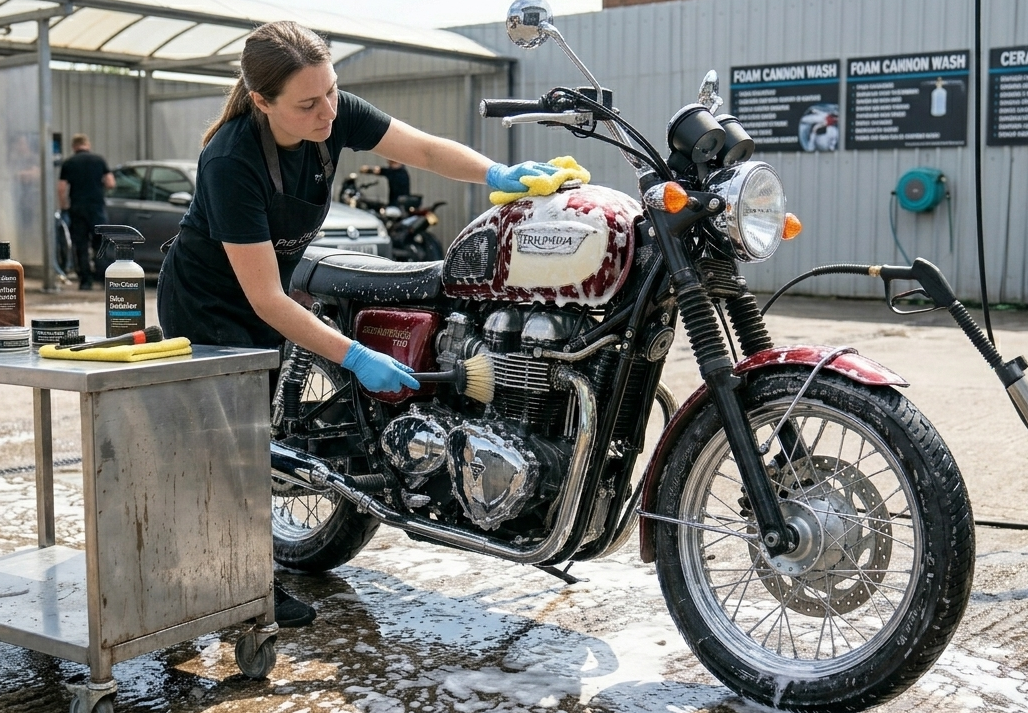 Thorough cleaning of the bike frame, fork, and body to remove dust and grime.